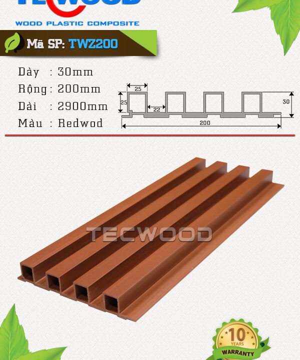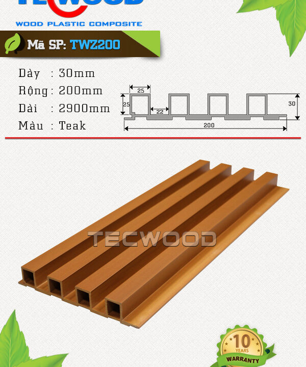 Tấm ốp gỗ nhựa TWZ200 thay thế cho các loại vật liệu ốp trần, tường truyền thống, đáp ứng tốt nhu cầu thẩm mỹ của khách hàng. Sảm phẩm được sản xuất theo công nghệ tiên tiến của Nhật bản với thành thành chính từ bột gỗ và nhựa tổng hợp WPC, mang đến những tính năng vượt trội nhự chống thấm nước, bền màu, mức độ giãn nở vì nhiệt thấp, ngăn tia cực tím, tia UV và bảo vệ sức khỏe người sử dụng,…